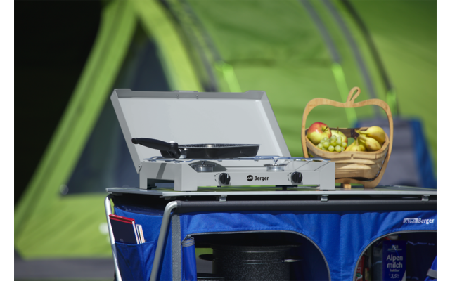 Durch eine spezielle Scharniertechnik ist die Abnahme des Deckels kinderleicht. Gumminoppen an der Unterseite verleihen dem Gaskocher mehr Standsicherheit. Gehäuse und Deckel aus pulverbeschichtetem Stahl. Robuster, verchromter sowie abnehmbarer Topfrost für sicheres Kochen und einfache Handhabung.