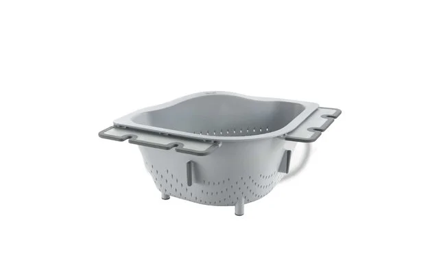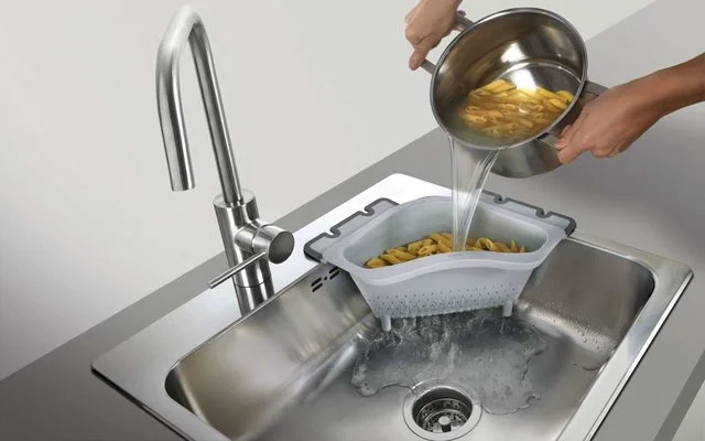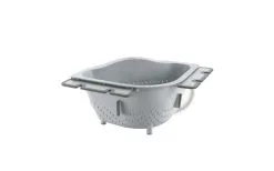 Drain-On Ecksieb aus Kunststoff, mit variablen Anti-Slip Klappen zur Befestigung am Spülbeckenrand.