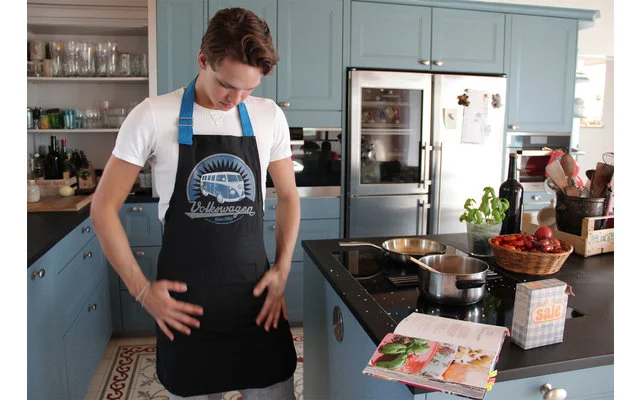 Schicke Bulli-Schürze mit kultigem Aufdruck im Retrodesign. Sie ist aus strapazierfähiger, fester Baumwolle und hat eine aufgenähte Tasche und verstellbare Nackenhalterung. Besonders wegen der Lieferung im Geschenkkarton ist die Kochschürze eine super Geschenkidee für echte VW Bulli Fans, Küchenakrobaten und Grillmeister. Maße Schürze: 58 x 80 cm