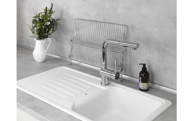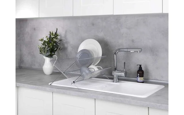Der praktische Geschirrabtropfer Duo aus verchromtem Metall bietet mit seinen großen Ablageflächen viel Platz für Teller und Geschirr. Da es auch im Zeitalter der Spülmaschine immer noch Geschirr und Besteck gibt, das besser von Hand gespült werden sollte, dient er als funktionelles Zubehör für die Spüle in Küche, Gartenhaus oder Wohnmobil. Durch die kreuzförmige Konstruktion finden Teller auf der oberen Ablagefläche optimalen Halt. Die seitliche Ablage bietet Platz für Tassen, kleinere Gläser oder Besteck. Bei Nichtgebrauch kann der Geschirrabtropfer platzsparend zusammengeklappt werden.